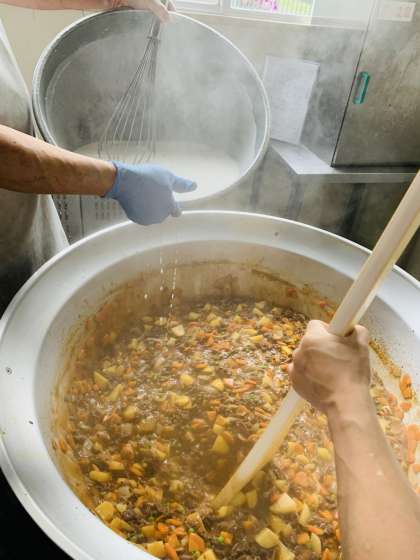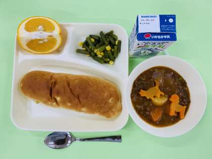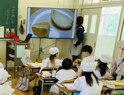 今年度より、食物アレルギー対応の一つとして、米粉のカレールウの素や米粉のマカロニなどを使用しています。今日のビーフシチューも、小麦粉でなく上新粉でとろみをつけています。あまなつかんは、皮が硬いので、教室では「皮むき名人になろう!」のスライドを見てもらいました。子ども達は、一生懸命皮をむいていました。