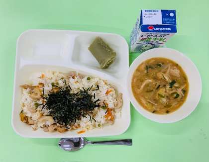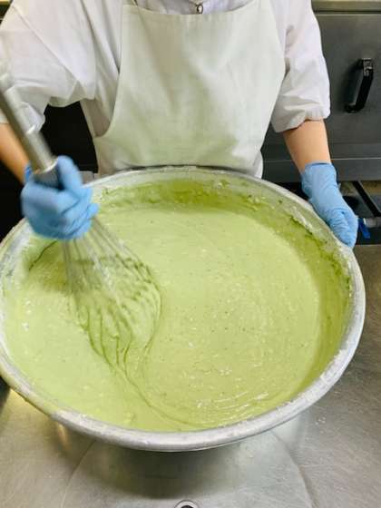 まっ茶は、摘んだ茶葉を臼で粉状にしたものです。香りがよく、お菓子の材料や料理などに使われます。今日は、白いんげんのペーストと砂糖、上新粉、水を合わせて、蒸しています。