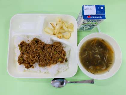 もずくは、「藻につく」からこの名前がついたといわれ、そのほとんどが沖縄県産のものです。今日は沖縄県の料理であるタコライスとともにいただきました。