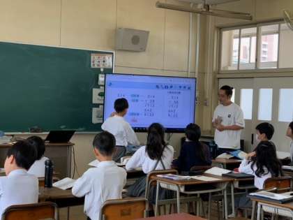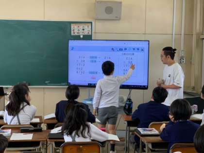 5年生の算数は習熟度別少人数授業です。小数のかけ算の筆算の仕方について学習しています。小数点をどう動かすのか、なぜそう考えたのか、自分の意見を発表しています。