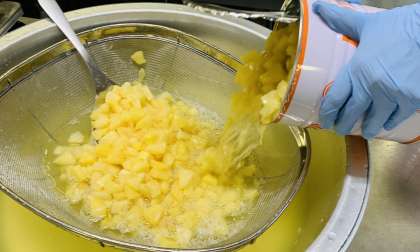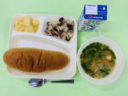 パインアップルは、ブラジルで生まれたくだものです。見た目が、松ぼっくり(パインコーン)ににていることや、りんご(アップル)のようにあまずっぱい味がすることから、この名前がつきました。給食室では、缶のパインアップルを開けて汁気を切ってから、クラスごとの食缶に入れています。