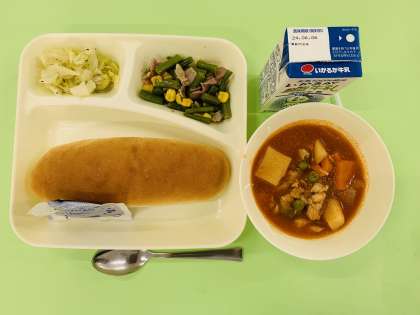 給食では、野菜をたくさん摂れるように献立が考えられています。今日の給食にも、100g以上の野菜が入っています。