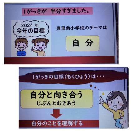 続いて、今年のテーマ「自分」について、1学期は「自分と向き合う」ことを目標にがんばりしょう。自分と向き合うとは、自分のことをよく知ること。自分のことって何?ということで