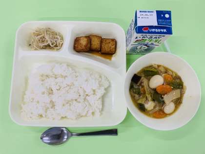 八宝菜の「八」は数が多いことを意味し、よい材料をたくさん使って作った料理のことをいいます。給食では、豚肉、うずら卵、キャベツ、たまねぎ、にんじん、たけのこ、ピーマン、しいたけの八種類の材料が入っていました。