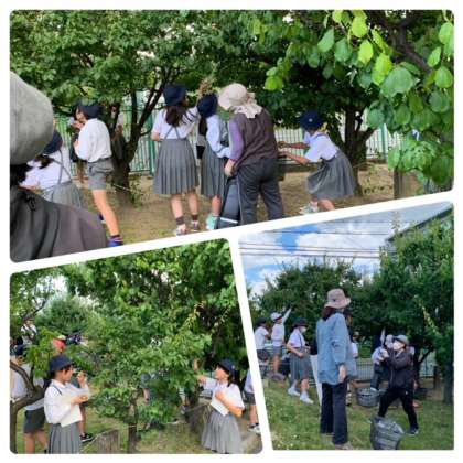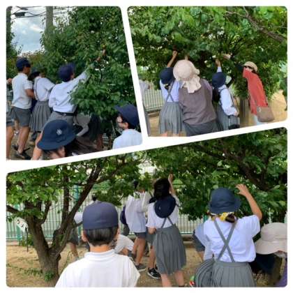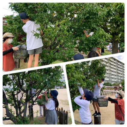 地域の方が早速、梅の実を狩りに来てくださいました。五年生が梅の実を取りたいと言っていたので、地域の方といっしょに、教えていただきながら梅の実狩りに挑戦しました。