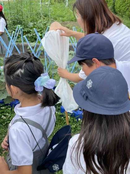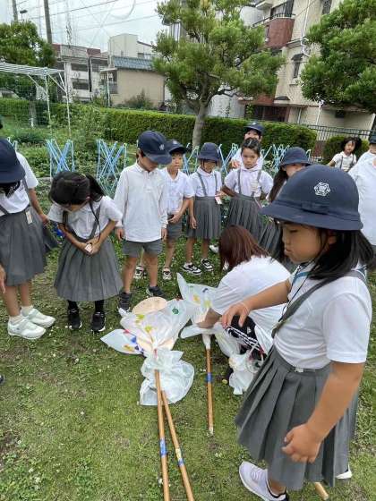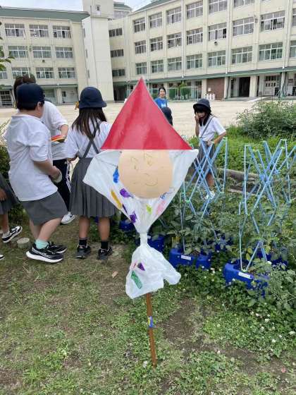 子どもたちが作っている野菜やお米を守るため、子どもたちが考え、「かかし」を作成しました。
