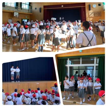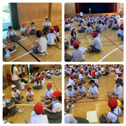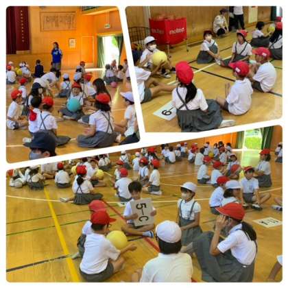 朝からなかなかの暑さでしたが、1学期最後のたてわり班集会がありました。班で円になってボールを回す、お馴染みの「爆弾ゲーム」です。ちょっと音楽とかがなくて、静かに始まりましたが、ボールが止まると、「わぁー!」と歓声も上がりました。もう少し楽しい雰囲気で進められるといいですね。集会委員会のみなさん、がんばって!