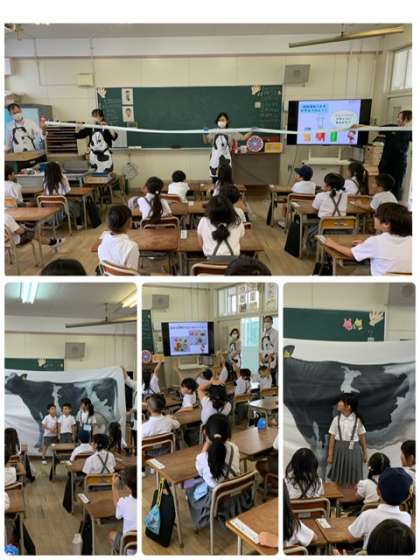 メグミルクの方に来ていただき、給食に毎回出る牛乳の栄養や、牧場から食卓に牛乳が届くまでの様子などを教えていただきました。