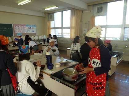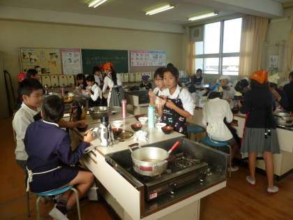 12月8日(火)3.4時間目に5年2組が、5.6時間目に5年1組が、調理実習を行いました。作ったのは「ごはんと味噌汁」です。はじめに説明を聞いて、役割を分担を確認してから調理実習に取り掛かりました。子ども達は、ガスコンロや包丁も慎重に扱って作っていました。どのグループも協力して楽しく実習をすることができていました。さて、ごはんと味噌汁の味はどうだったでしょうか。