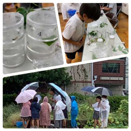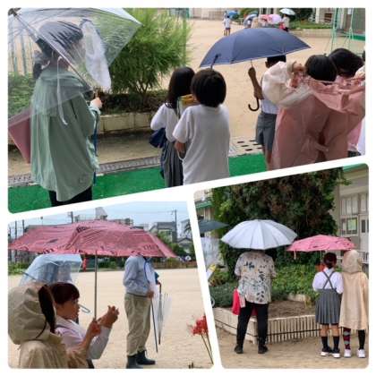 あいにくの雨でしたが、傘をさして校内の生き物を探しに行きました。