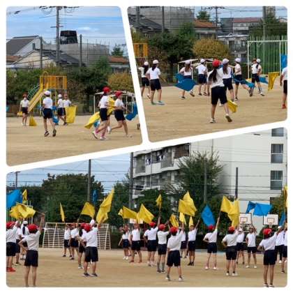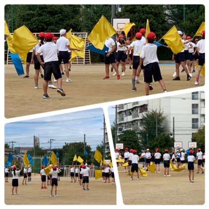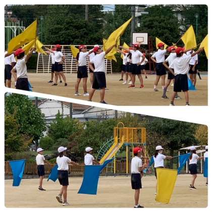 運動場に、気持ちよく旗を振る音が響くと、6年生の練習が始まった合図です。さすがに6年生、先生がマイクで淡々と指示を与えるだけで、練習がどんどんと進んでいきます。今はまだ、ひとつひとつの動きを確認しながらですが、ここからどんどんと精度をあげて、一糸乱れぬ統率のとれた動きを磨きあげていってほしいと思います。