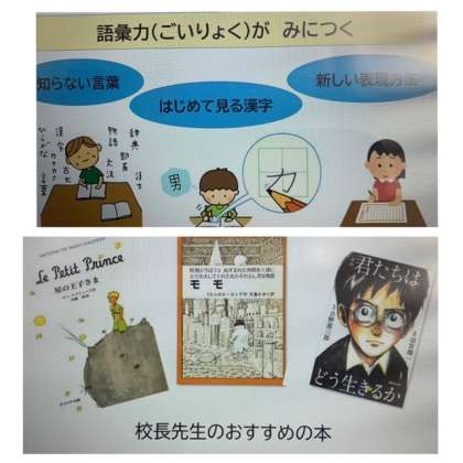 校長先生からは、読書週間にちなんで本を読むことのよさや、おすすめの本についてお話しまた。