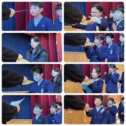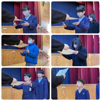 読書週間にたくさん本を読んだ「読書名人」にはじまり、絵画・版画展、防災図画、人権作文と全部で14人の表彰をしました。