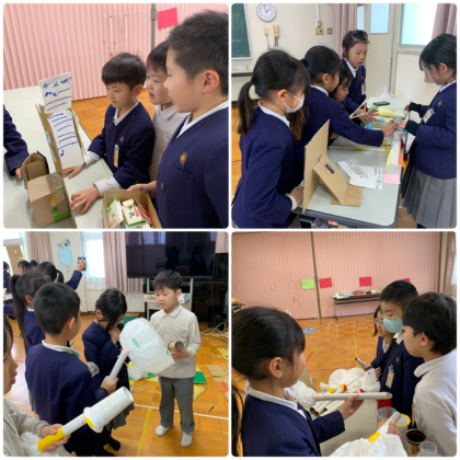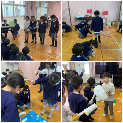 2年生が1年生を招待しておもちゃランドを開催しました。自分たちが作ったおもちゃで1年生に楽しんでもらいたいと準備をしてきました。