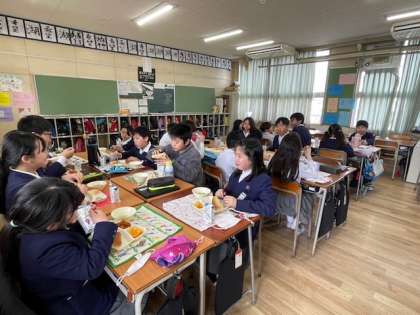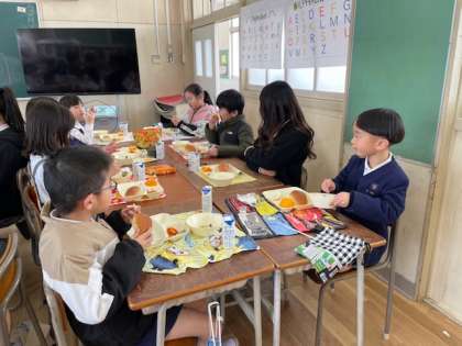 それぞれの教室に分かれて、1年生から6年生までのメンバーと班の担当の先生といっしょに食べました。
