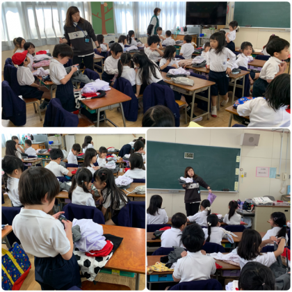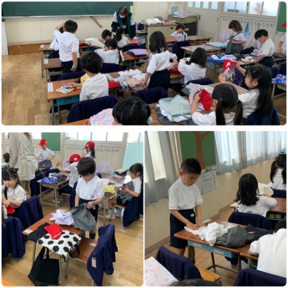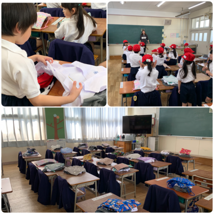 一年生が体育の授業のため着替えをしています。脱いだ服をていねいにたたんで机の上に重ねます。