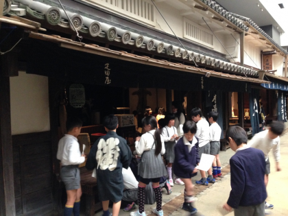 1月26日(火)3年生は、くらしの今昔館と天神橋筋商店街へ社会見学に行きました。はじめに江戸時代に着ていた着物の紹介がありました。次に昔の使われていた道具をクイズ形式で紹介してもらいました。蔵のカギや炭を入れて使うアイロン、てんびんばかり、筆を入れて持ち運ぶ道具などめずらしい物が次々と登場し子ども達は大喜びでした。お話が終わると館内を見学しました。江戸時代の町屋を見たり、昔の道具などを見ました。昼からはグループに分かれて、天神橋筋商店街のお店で働いている人にインタビューをしました。短い時間でしたが、子どもたちは熱心に聞いてメモを取っていました。ご協力いただきました商店街の皆様ありがとうございました。