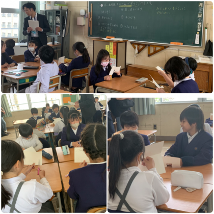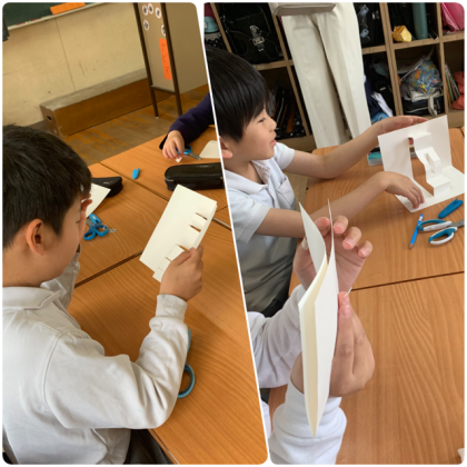 4年1組は白い画用紙を二つに折って、はさみで切り込みを入れて、何かつくっています。画用紙に切り込みを入れるだけで何かオブジェを作っているようです。