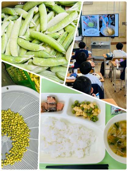 学校給食では、旬の食べものがたくさん出ます。5月2日は、えんどう(生のグリンピース)が出ました。和歌山県から届いたものを、給食調理員さんがひとつひとつさやから豆を出します。さやの数は何と約900個!えんどうの動画を見て、子ども達からも「おいしい〜!」の声がたくさん聞こえました。