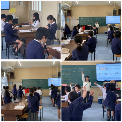 リコーダーを練習した後、新しい歌を習いました。前に習った歌と比較して、新しい歌の感じは、楽しい、明るい、元気な感じがすると話し合いました。