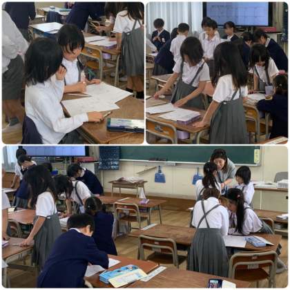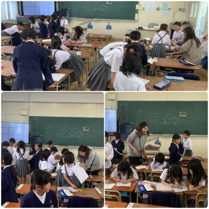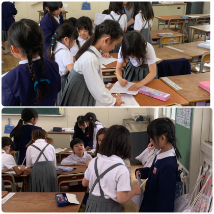 みんながんばって毎日新しいことを学んでいます。今日は教室を自由に歩いて、友達に声をかけてサインをもらっています。たくさんのマスを友達のサインで埋めるために自分から積極的に声をかける子、少し恥ずかしくてもじもじしている子、自分は動かずに頑なに相手が来てくれるのを待っている子、とさまざまです。