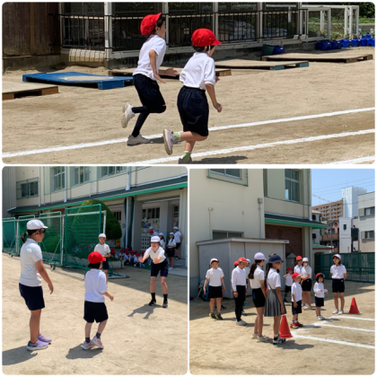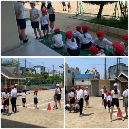 1年生も6年生にサポートしてもらいながら、スポーツテストをやっています。