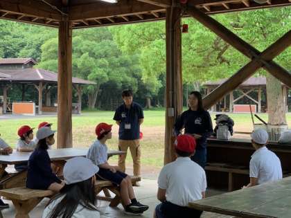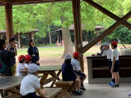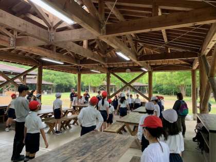 雨が降っていますので、炊飯場で開舎式をしました。今から学級写真を撮って、雨の中、なんとか火起こし体験をやる予定です。