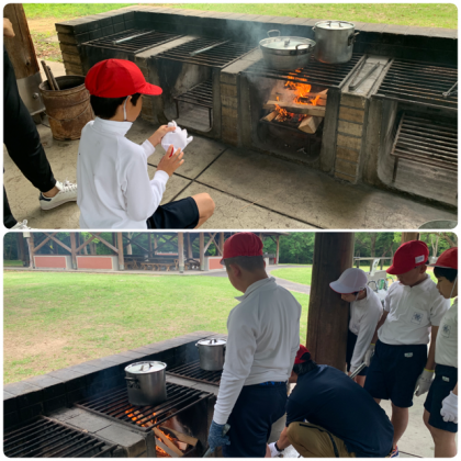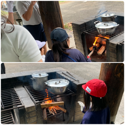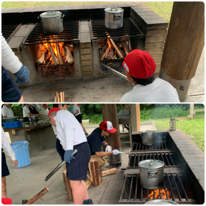 いよいよかまどに薪をくべて火を起こします。気温と湿気のせいか、なかなかうまく火が起こらずに苦労しています。