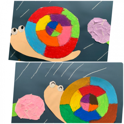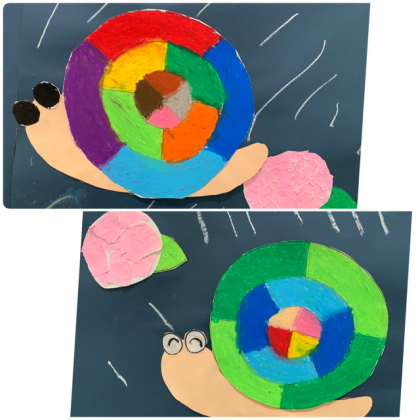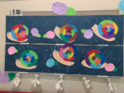 一年生の描いた、すてきなカタツムリが掲示されていました。一人一人、デザインや表情が違っていて、見ていて楽しいです。