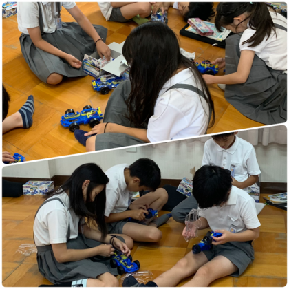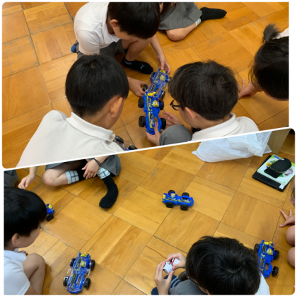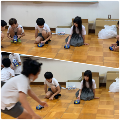 電流の働きを車を使って学習しています。直列に電池をつないで、車を後ろに走らせるにはどうしたらいいかな、考えてやってみようと先生が言った瞬間に、すぐに電池の向きを変えて、どんどんと車を走らせる子どもたちでした。