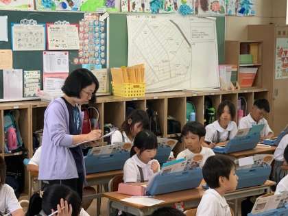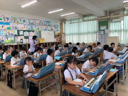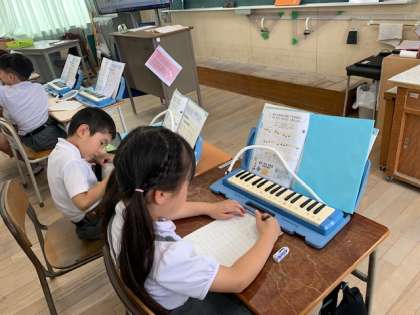 2年1組が音楽の学習をしています。今日は鍵盤ハーモニカのテストのようです。一人ずつ演奏していきます。みんなが聞いているなか、一人で演奏するので少し緊張気味です。
