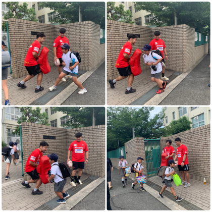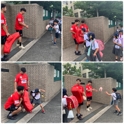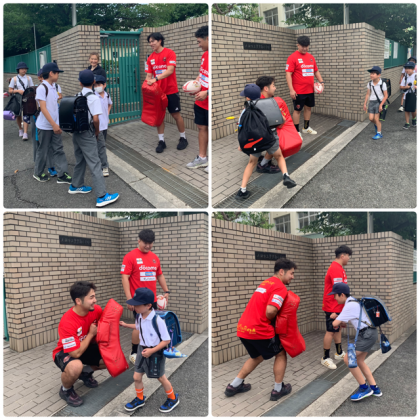 今日はNTTドコモのラグビーチーム、レッドハリケーンズのみなさんが来てくださいました。朝の登校時から正門に立って、子どもたちのタックルを受けたり、ボールをパスしたりと、朝の気だるい雰囲気を盛り上げてくださいました。高学年の男子はさすがのナイスタックル!