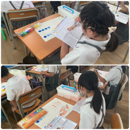 自分の好きな一色の絵の具で、水の量を変えたり、白を混ぜたりして、いろんなバリエーションの色ができるんですね。
