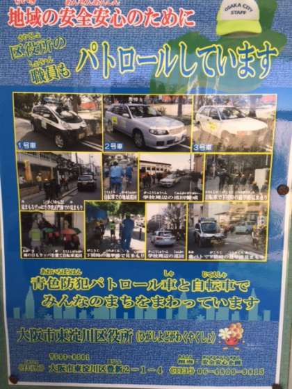 地域の見守り隊だけではなく、東淀川区役所の職員の皆さんも、青色防犯パトロール車や自転車で、児童の登下校や放課後の時間にパトロールをしてくださっています。