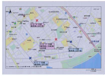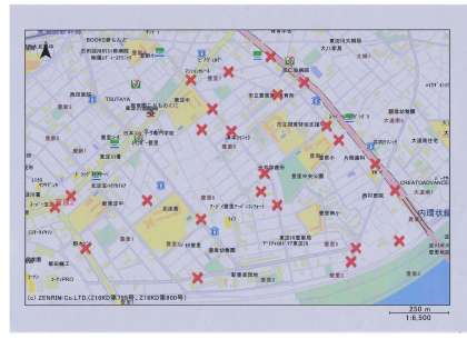 昨年4月から今年の6月までに、学校付近で「子どもが関わった交通事故」(警察に届けられているもの)の発生場所を地図で示していただきました。