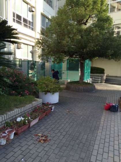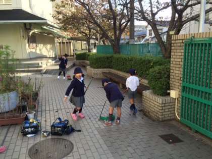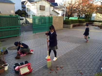 朝の登校時間前、正門付近の落ち葉をお掃除してくれている5年生女子がいました。