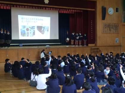 今朝は、図書委員会の担当でした。活動の報告やクイズ、読み聞かせもありました。