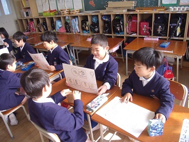 1月20日(月)国語科「じゃんけんやさんをひらこう」では、自分たちで考えたじゃんけんで、じゃんけんやさんを開きました。1組では教頭先生にも参加してもらいました。おはじきをお金の代わりにして、お店屋さんから説明を受けじゃんけんをします。「騎士、王様、ドラゴン」や「すし、わさび、人」「炎、水、風」など、ユニークなじゃんけんをたくさん考えることができました。