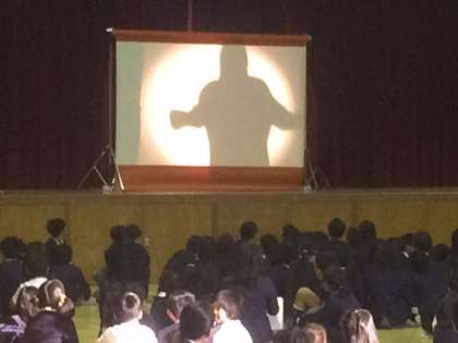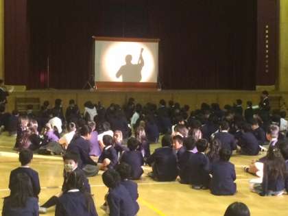 今朝は、集会委員会の皆さんがMCをつとめ、「シルエットクイズー先生当て」をしてくれました。