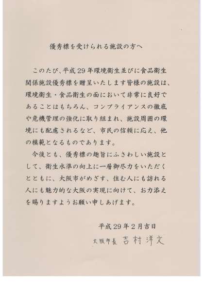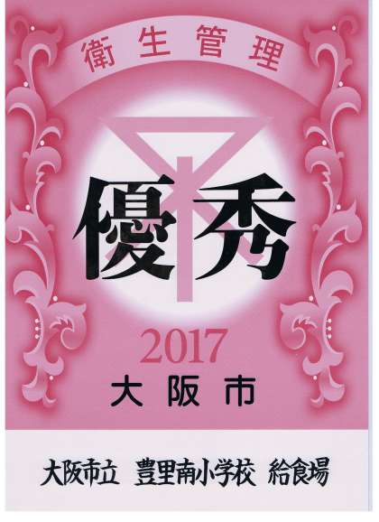 給食調理室の衛生管理について、吉村市長より「優秀票」をいただきました。