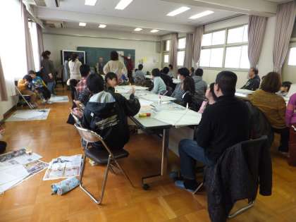 1月26日(日)子供会主催でたこづくり教室が多目的室で開かれました。子ども25人と保護者15人が参加し、子供会元会長の佐久川さんと現会長の行貝さんにたこの作り方を教えていただきました。低学年の子ども達は保護者の人に手伝ってもらいながら完成させました。2月9日(日)淀川河川敷で開かれる区子連のたこあげ大会がとても楽しみです。