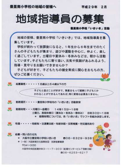 平成29年度に向け、「地域指導員さん」を募集されています。(お子さんを本校に通わせておれれる保護者は、対象外です)