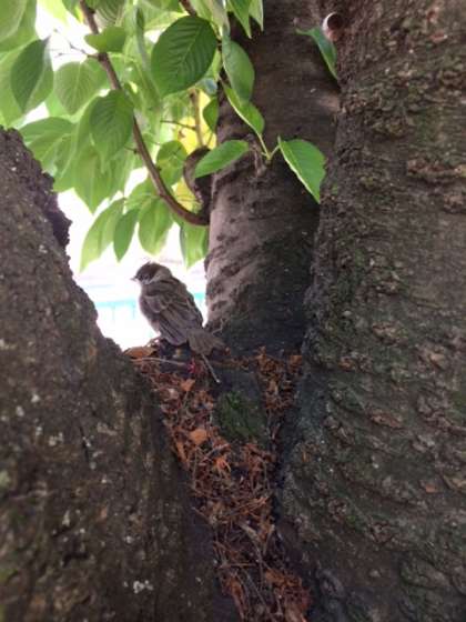 今日の登校途中に、飛べないスズメのヒナが巣から落ちているのを見つけてくれた子がいました。