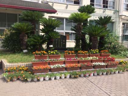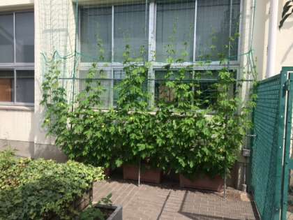 管理作業員さんと教頭先生が設置してくれた「みどりのカーテン」のゴーヤもこの土日で一気に伸び、黄色い花も咲き始めました。