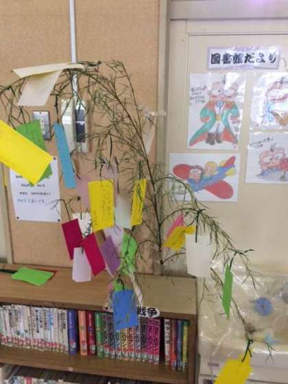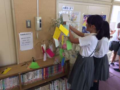 今日は、校庭がつかえなかったこともあり、昼休みには、たくさんの児童が図書室を訪れ、願い事を書いた短冊をくくりつけていました。