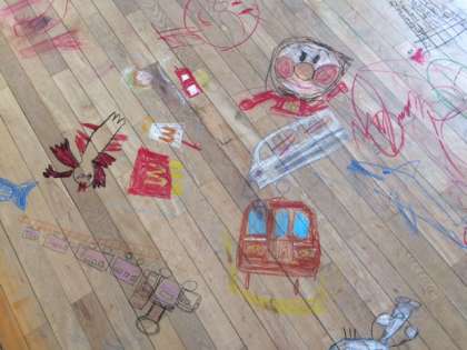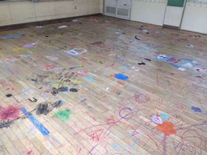 机・椅子、その他物品の移動後に、それぞれのクラスでは、お世話になった床に『想い』『気持ち』『願い』等をペイントしました。