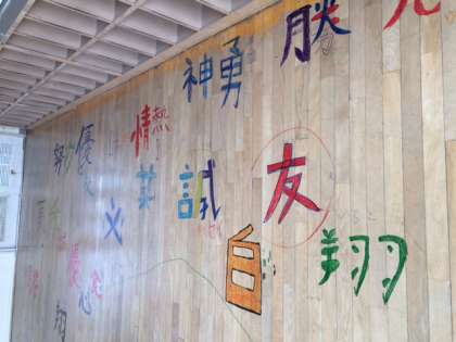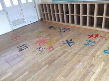 机・椅子、その他物品の移動後に、それぞれのクラスでは、お世話になった床に『想い』『気持ち』『願い』等をペイントしました。