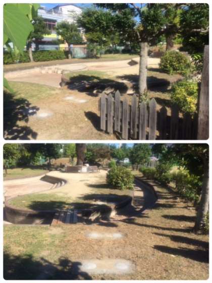 (池の水は、夏休み終盤に入れる予定です。メダカたちは、理科室の水槽で過ごしています。)