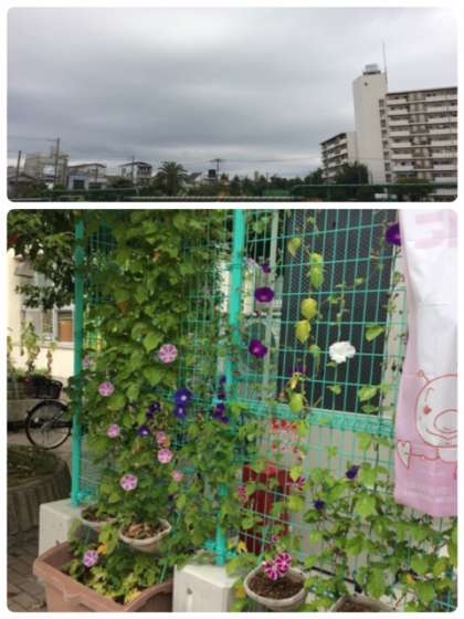 曇天(どんてん)ですが、玄関のアサガオは最後の夏を惜しむように咲いています。