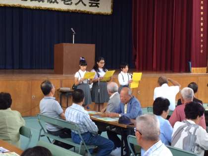 本校6年生3人(市田さん、田畑さん、山田さん)が、お祝いのことばを送り、90歳以上のお年寄りに記念品贈呈の大役を務めてくれました。